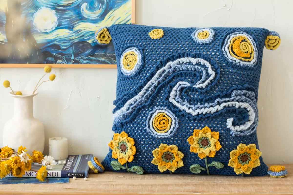 Think swirling skies, sunflower golds, and expressive texture. This art-inspired piece sits at the intersection of Creative Crochet Ideas and painterly color-work.