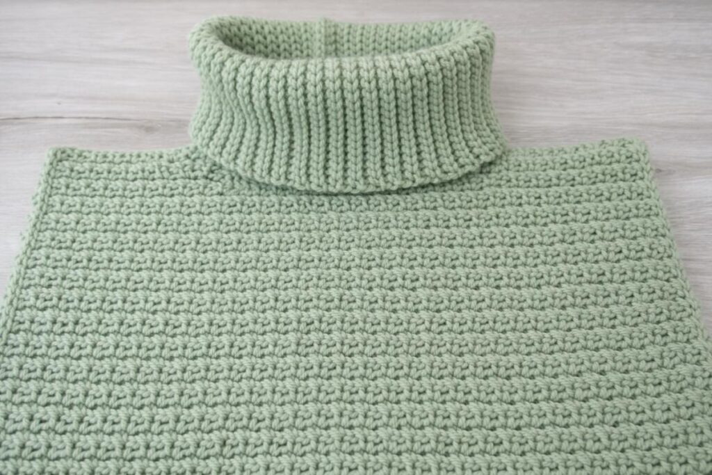 The turtleneck is the detail that really elevates the whole piece. When you reach that section, focus on keeping your stitch tension consistent so the neckline looks smooth and sits comfortably.