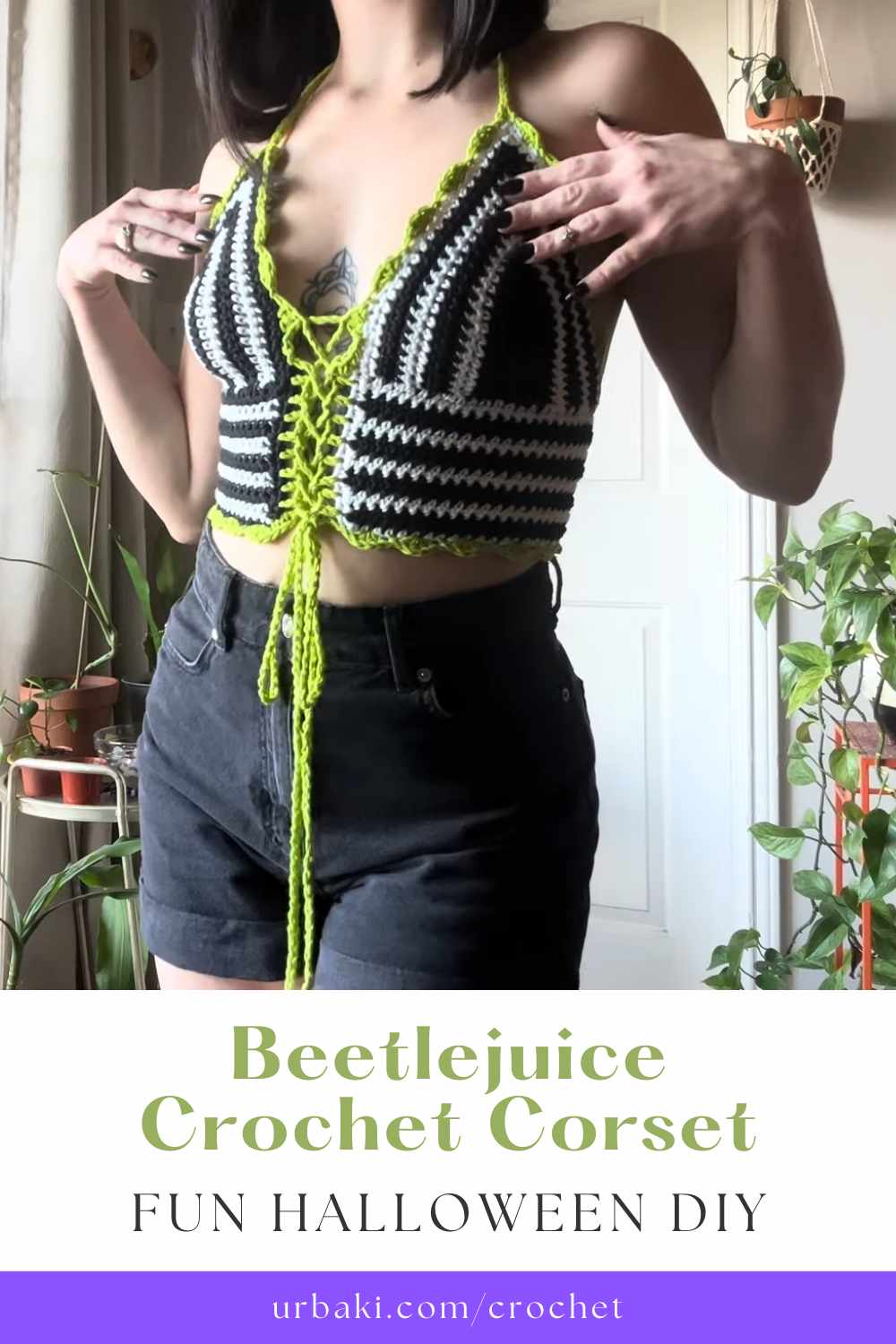 We’re talking about a Beetlejuice crochet corset—a fun and easy way to add a handmade touch to your Halloween costume. With a crochet hook, some yarn, and the guidance of the talented Made by BJax, you can craft your very own corset that fits all sizes!