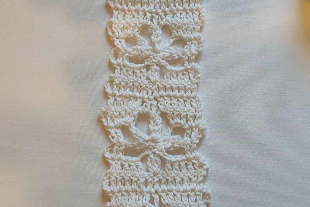 The finished lace pattern features small, layered flowers joined in a continuous strip, creating an airy and textured look.