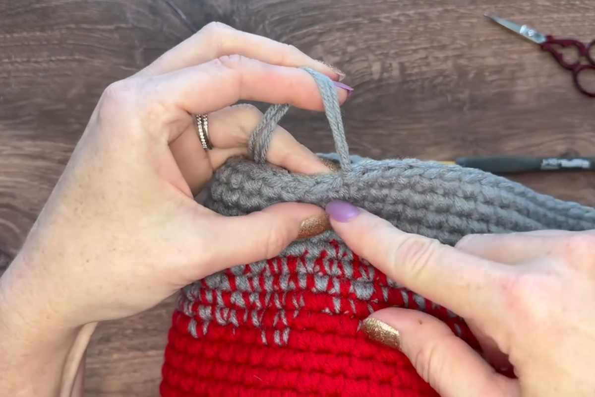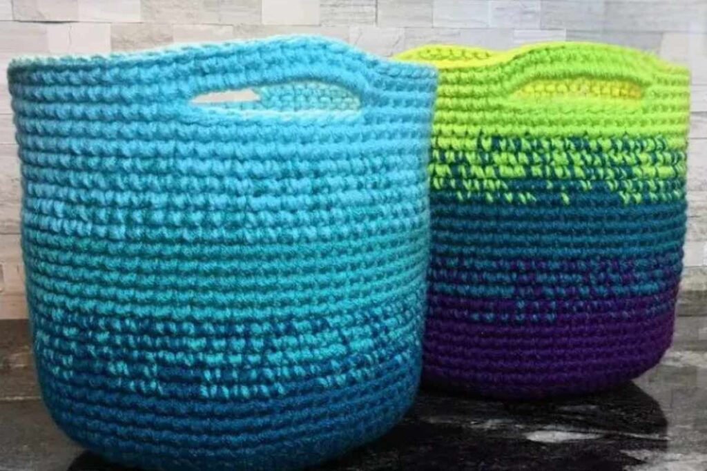 The pattern uses basic stitches that form a dense, durable fabric, allowing the basket to hold its shape without extra reinforcement.