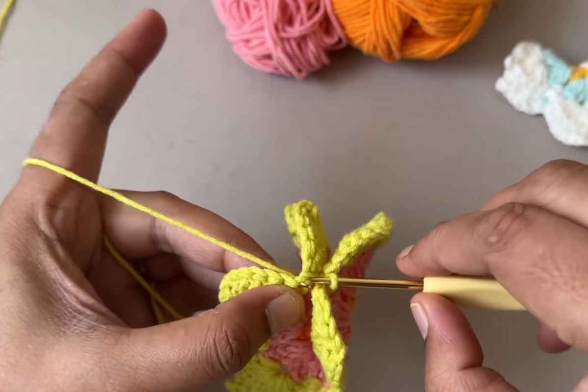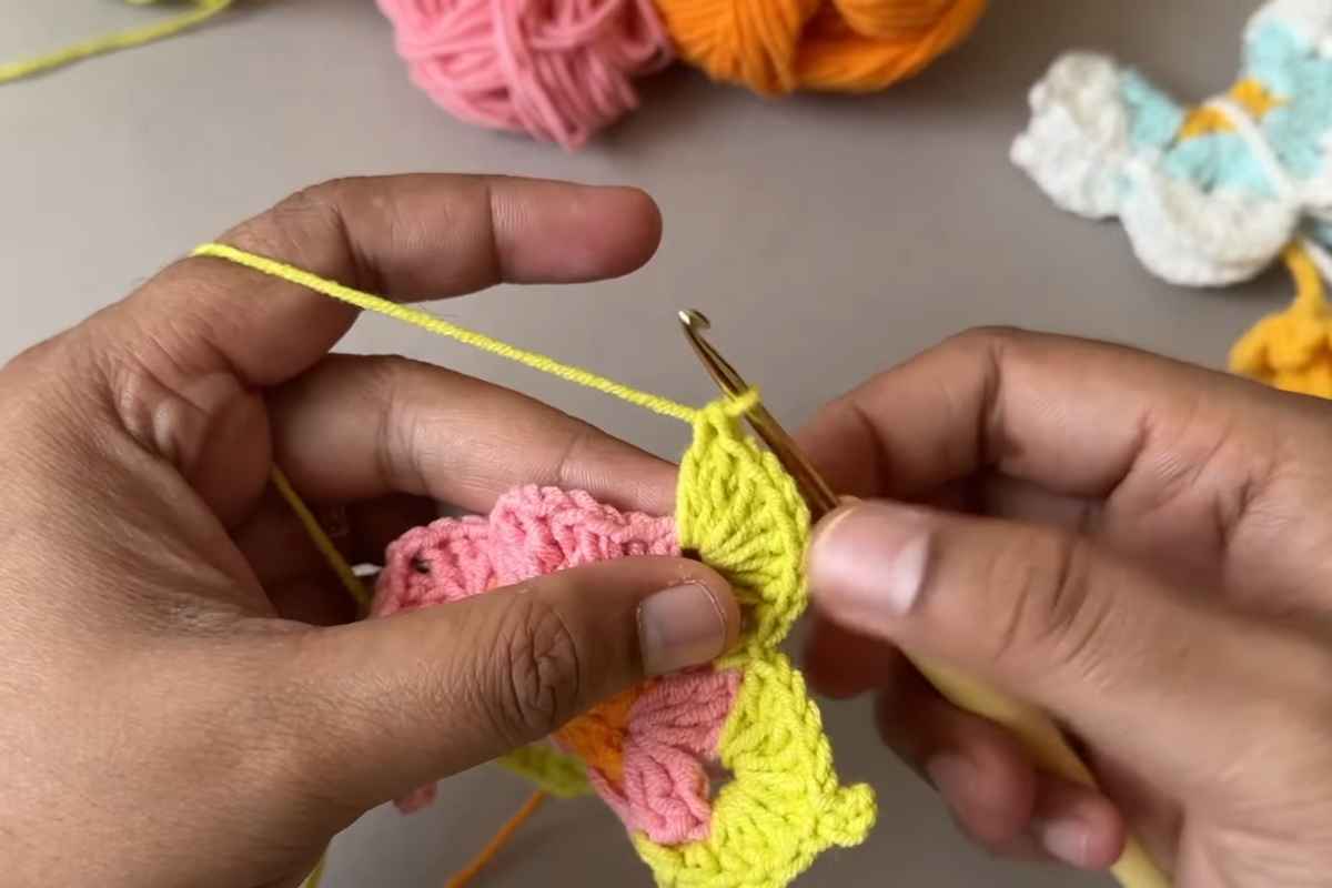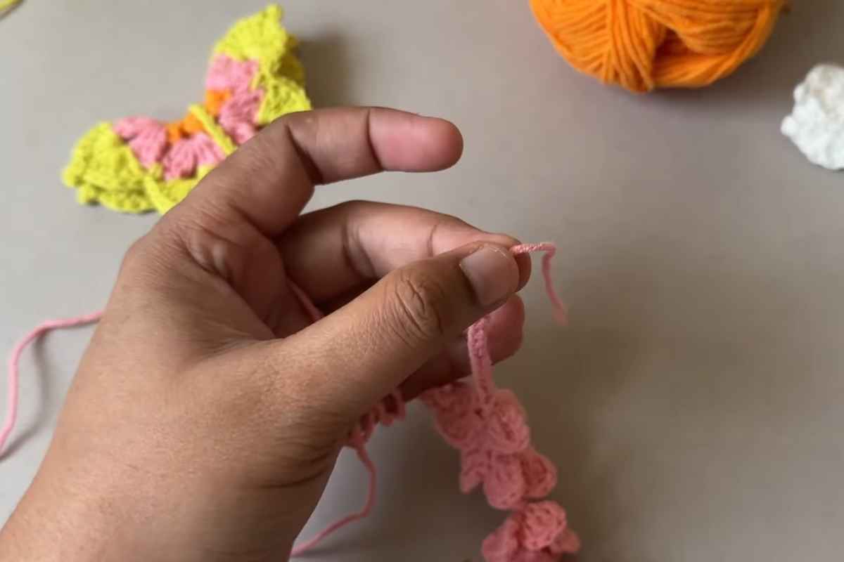 - Body wrap: Attach body color (neutral) at the top center where upper wings meet. Chain 8–12 (length depends on your butterfly height), then lay the chain down the center seam.
