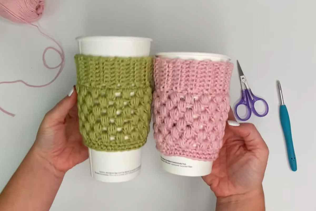 The Claire Cozy hot cup crochet sleeve is a cute and practical way to stay cozy and sustainable while enjoying your morning coffee.