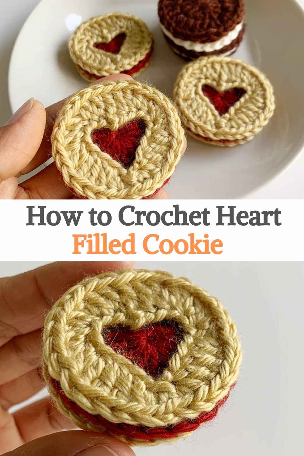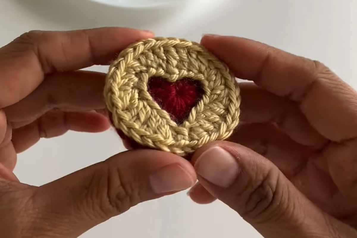 Making these crochet heart-filled cookies is a delightful process. The pattern involves crocheting a round cookie base and then adding a heart-shaped filling to the center.