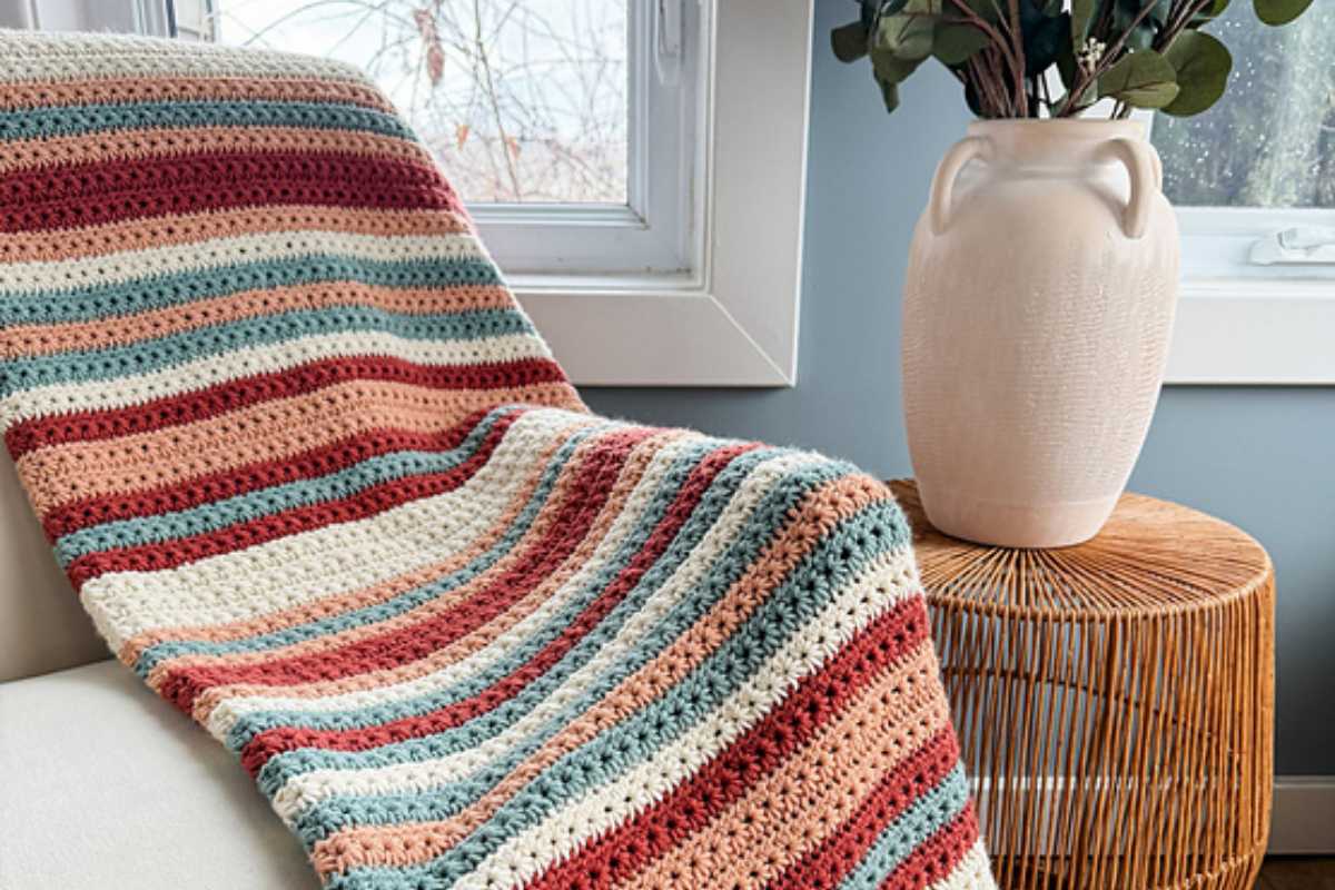 Light, airy, and wonderfully drapey, the Aura Blanket shows how crochet patterns blanket can feel elegant with openwork panels. It’s a breezy make that shines in soft gradients or solid pastels.