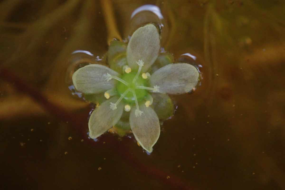 Aldrovanda vesiculosa produces small white flowers that bloom briefly above the water surface, with pollination required for seed production.