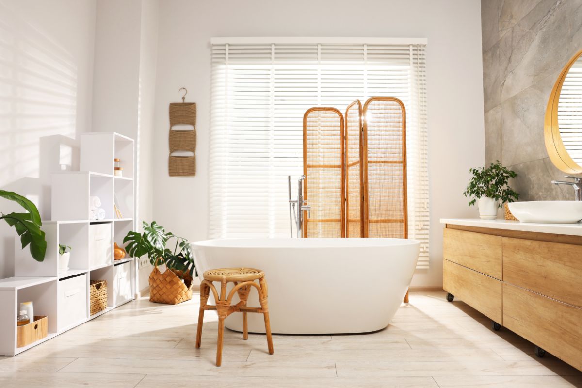 while warm tan adds a subtle glow that feels both cozy and welcoming. You can incorporate these colours through accessories like shower curtains, lampshades, or decorative storage baskets.