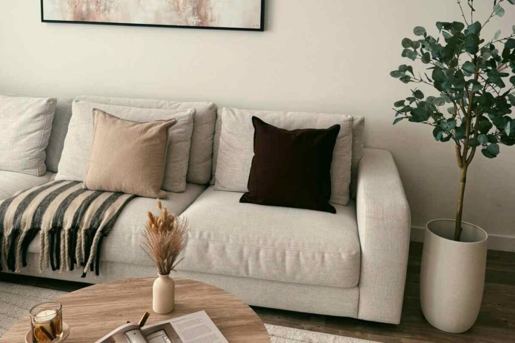 Start with a single statement piece in a natural material to anchor your composition—think a wood coffee table or a travertine side table.
