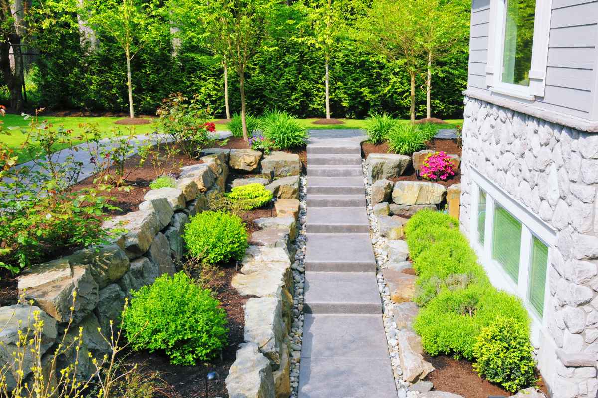 Retaining walls and garden borders are excellent choices for creating separation between different sections of your landscape, like flower beds, lawn areas, and vegetable gardens.