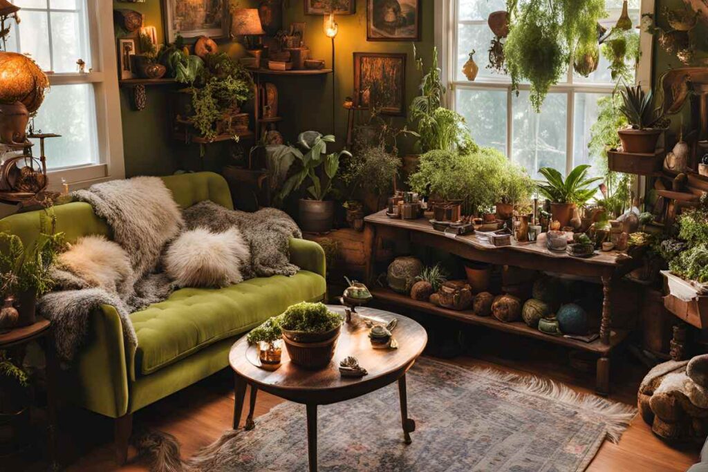 Soft furnishings like patterned Goblincore pillows and earth-toned upholstery can further enhance the look of your bedroom or living space.