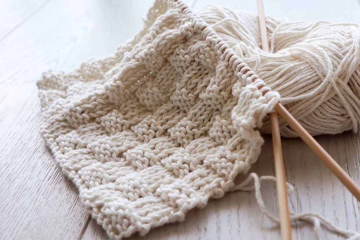 The basket-weave structure alternates knits and purls to mimic woven squares—classic, textured, and practical.