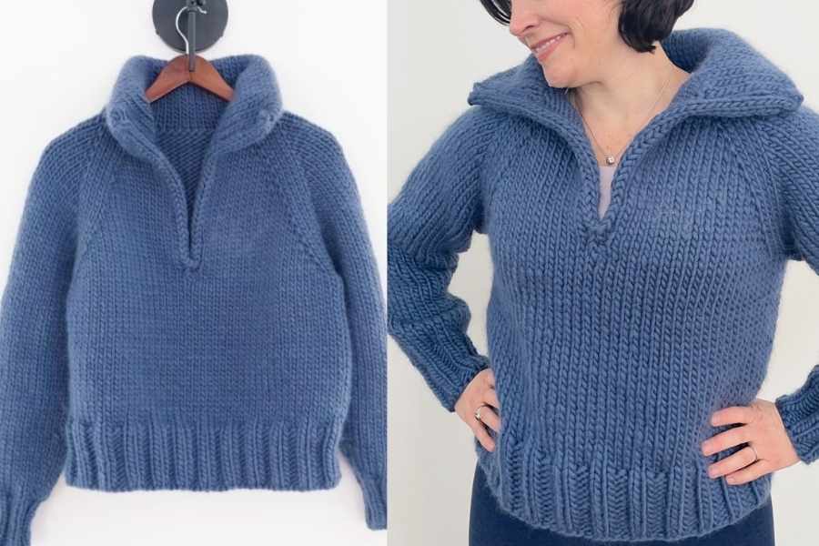 This sweater is knitted top-down, which means the collar is worked first, folded over, and knitted at the top and bottom to create the double collar.